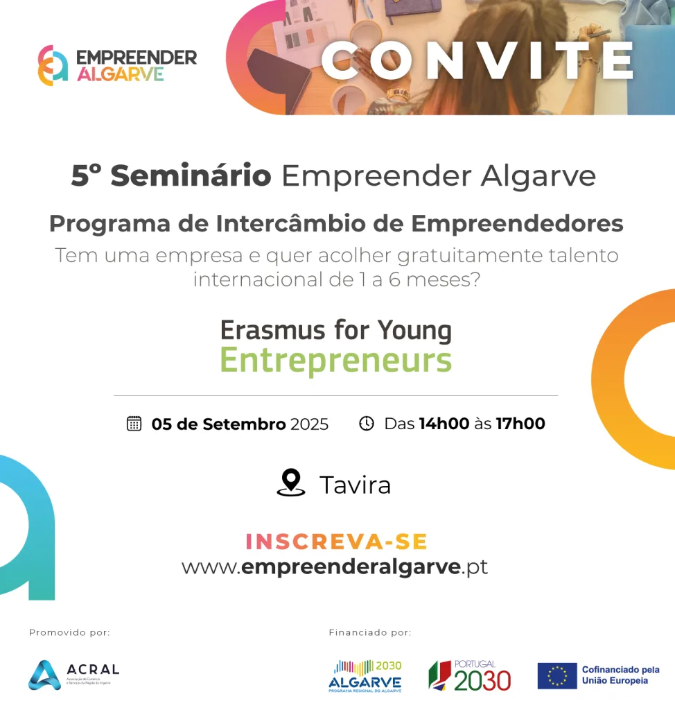 No próximo dia 05 de setembro de 2025, das 14h00 às 17h00, Tavira recebe um seminário promovido pela ACRAL – Associação do Comércio da Região do Algarve, no âmbito do projeto Empreender Algarve dirigido às empresas que podem acolher, sem custos, empreendedores internacionais por períodos de 1 a 6 meses e para todas as pessoas empreendedoras que pretendam crescer, inovar e/ou internacionalizar os seus negócios.