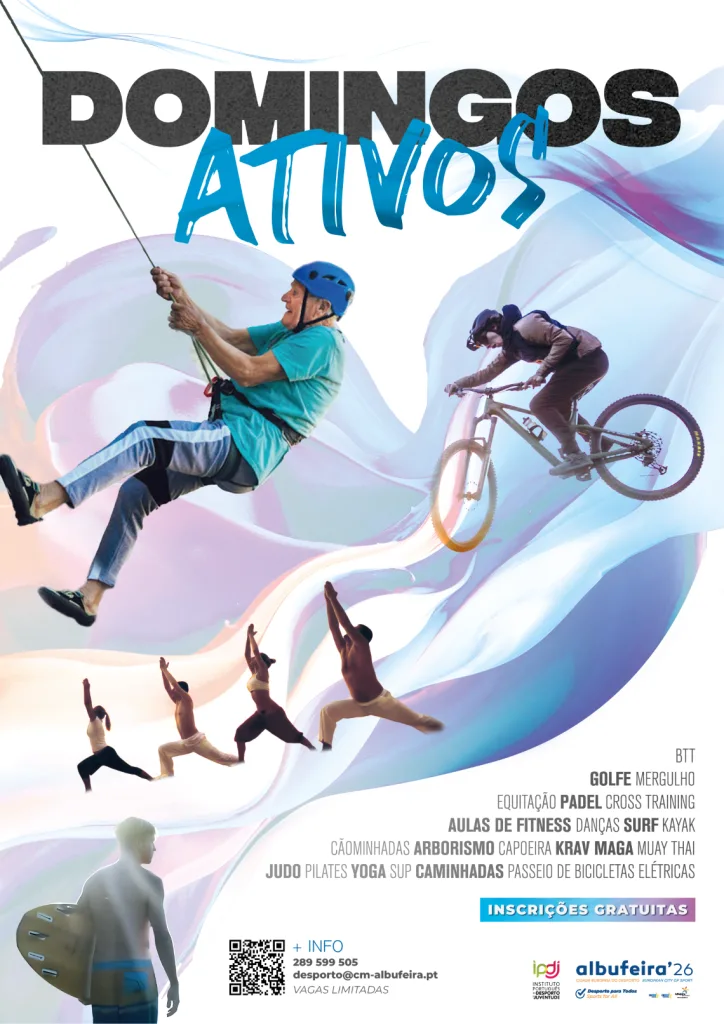 Num ano em que Albufeira é Cidade Europeia do Desporto 2026, o Município vai promover um conjunto de iniciativas destinadas a incentivar a atividade física. O projeto “Domingos Ativos” é direcionado à população em geral, e vai contar com ações distribuídas ao longo de todo o ano. Estão previstas atividades em modalidades como o golfe, equitação, mergulho, e muitas outras. A participação é totalmente gratuita.