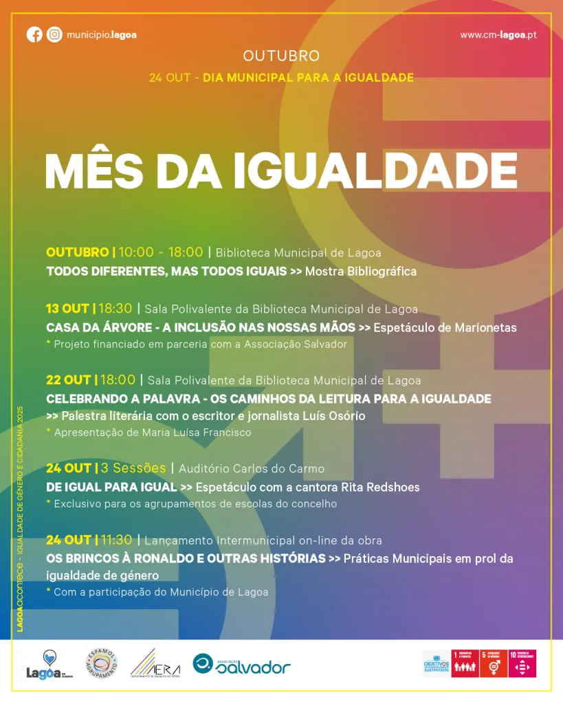 Nesse sentido, o Município de Lagoa adere uma vez mais a estas comemorações nacionais do Dia Municipal para a Igualdade, assinaladas a 24 de outubro, através da promoção de diversas iniciativas que pretendem alertar e sensibilizar para a igualdade de direitos e oportunidades, concorrendo para as metas do ODS 5 – Igualdade de Género da Agenda 2030 para a sustentabilidade, recorrendo para tal a diferentes expressões artísticas e culturais ao longo do mês de outubro repleto de atividades para públicos diversos.