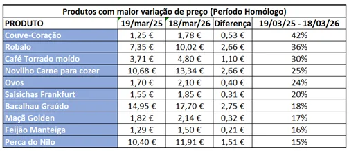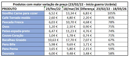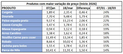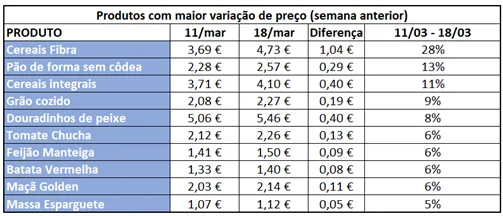 Na última semana, entre 11 e 18 de março, os produtos cujo preço mais aumentou percentualmente foram os cereais de fibra (28% para 4,73 euros), o pão de forma sem côdea (13% para 2,57 euros) e os cereais integrais (11% para 4,10 euros). Comparando com o mesmo período do ano passado, a maior subida percentual de preço verificou-se em produtos como a couve-coração (42%, custando atualmente 1,78 euros), o robalo (36%, situando-se atualmente nos 10,02 euros/kilo) e o café torrado moído (30%, o que se reflete num custo de 4,80 euros).