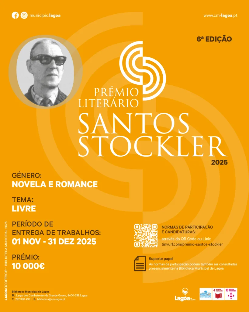 O Município de Lagoa abre as candidaturas para a 6ª edição do Prémio Literário Santos Stockler no próximo dia 01 de novembro, pelas 10h00, podendo entregar os seus trabalhos até ao dia 31 de dezembro de 2025 no Portal Municipal.
