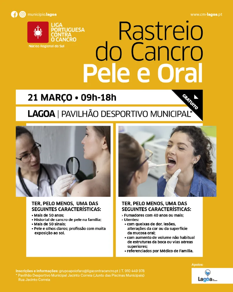O Município de Lagoa associa-se à iniciativa 𝗥𝗮𝘀𝘁𝗿𝗲𝗶𝗼 𝗱𝗼 𝗖𝗮𝗻𝗰𝗿𝗼 𝗱𝗮 𝗣𝗲𝗹𝗲 𝗲 𝗢𝗿𝗮𝗹, promovida pela Liga Portuguesa Contra o Cancro – Núcleo Regional do Sul, que terá lugar em Lagoa.