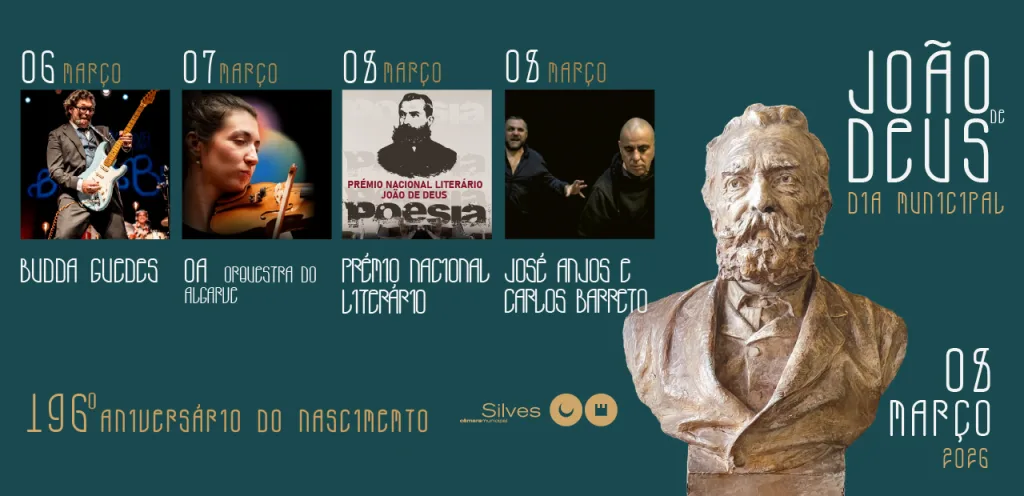 No próximo dia 08 de março, o Município de Silves, assinala uma das datas mais relevantes do seu calendário, o aniversário de nascimento do ilustre poeta lírico e pedagogo João de Deus. O programa cultural das comemorações do Dia Municipal João de Deus, decorre entre 06 e 08 de março, com propostas diversificadas, que contemplam sessões de Jazz nas Adegas, Lado B com Budda Guedes, momento de homenagem, concertos e Prémio Nacional Literário João de Deus.